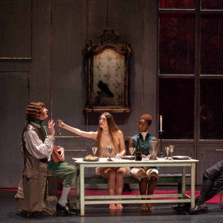 Dans une mise en scène élégante et troublante, elle entoure le héros de fantômes baroques et de visions oniriques, transformant la pièce en un ballet d’ombres et de désirs. Fidèle au texte de Molière, elle en déploie la puissance