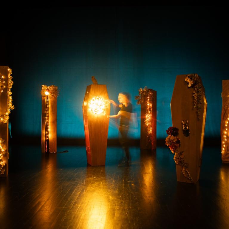 Thanatopracteurs, fossoyeurs, funeral planners, anthropologues, psychologues, responsables de cimetières ou de forêts cinéraires : pendant deux ans, Julie Benegmos et Marion Coutarel ont recueilli les gestes et les mots de celles et ceux qui côtoient les morts au quotidien, ainsi que les us et coutumes des vivants qui les accompagnent. Face au constat sans appel de l’anéantissement du sens des rites sous le joug du profit, leur pièce atmosphérique s’offre comme une page blanche pour penser autrement la célébration des êtres qui nous sont chers. Projeté dans un décor des pompes funèbres, le public perd lentement ses repères, qui glissent un à un vers des imageries et références plus poétiques, sensibles, évocatrices. Entre manipulation d’objets, d’images et de sons, les metteuses en scène développent dans cette troisième création le fil ténu d’un théâtre libre et sans filtre. Tandis que les voix sont celles de comédiennes invisibles, les gestes des interprètes se font ceux de régisseurs techniques de situations. Naît ainsi, dans ce paradoxe entre l’absence et l’omniprésence fantomatique, comme un climat de deuil, d’empathie, et se ressent quelque chose de commun : le besoin de réenchanter les rituels collectifs, ou de « soigner les morts pour guérir les vivants » (Magali Molinié, 2006).