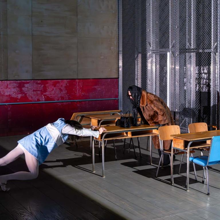 Ce « présent total », c’est précisément ce que le metteur en scène parvient à cristalliser ici en une oeuvre tout aussi totale. Dans une scénographie déroutante signée Małgorzata Szczęśniak, d’angoissants espaces transitionnels reflètent le no man’s land mental dans lequel serpente le trauma, heurtant les figures de Wediaa, Mégara, Jovette, les filles d’Europe, ou sautant insidieusement une génération pour dévorer son petit-fils Zacharie d’une violence ancestrale. Tandis qu’une vidéo hypnotique traque les secrets dans l’intimité des visages – victimes, témoins, complices, instruments ? –, dans la salle de classe rouge sang, qui vire du théâtre horrifique au tribunal des mémoires, se joue, entre allégorie et hyperréalisme, la question de notre responsabilité de descendants.