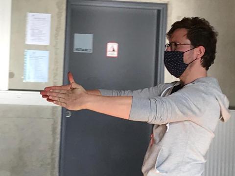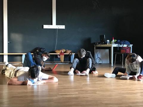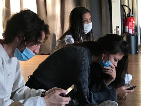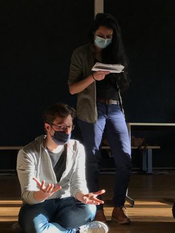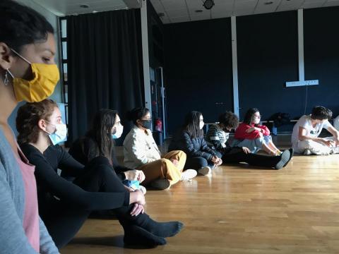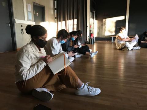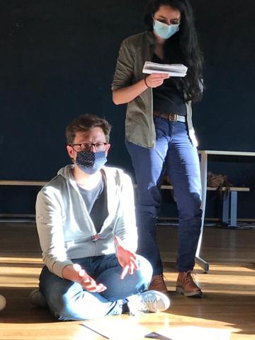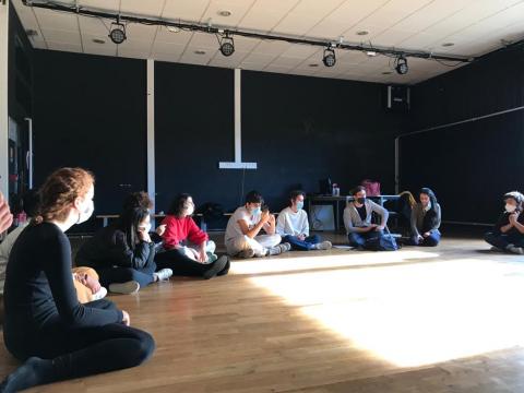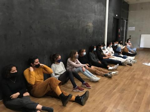Emmanuelle Bertrand, comédienne et Camille Daloz, metteur en scène de la compagnie Le Cri Dévot qui devait jouer les 24 et 25 novembre derniers au domaine d'O Les Instantanés Une Femme & La Place d'après Annie Ernaux et qui a dû être annulé pour cause de crise sanitaire, ont tenu un atelier mercredi 2 décembre auprès de 17 élèves de la classe de terminale option théâtre de Jessica Ramassamy.